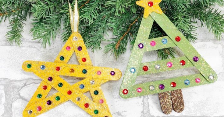 Children build small ornament shapes from popsicle sticks, then paint and decorate them. These low-prep ornaments are perfect when you need several easy Christmas crafts for 3rd graders for a party or co-op.