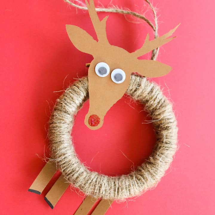 Kids turn a small embroidery hoop into Rudolph with brown fabric, felt ears, googly eyes, and a red pompom nose. This Christmas ornament craft is simple enough for third graders but cute enough to give as a gift.